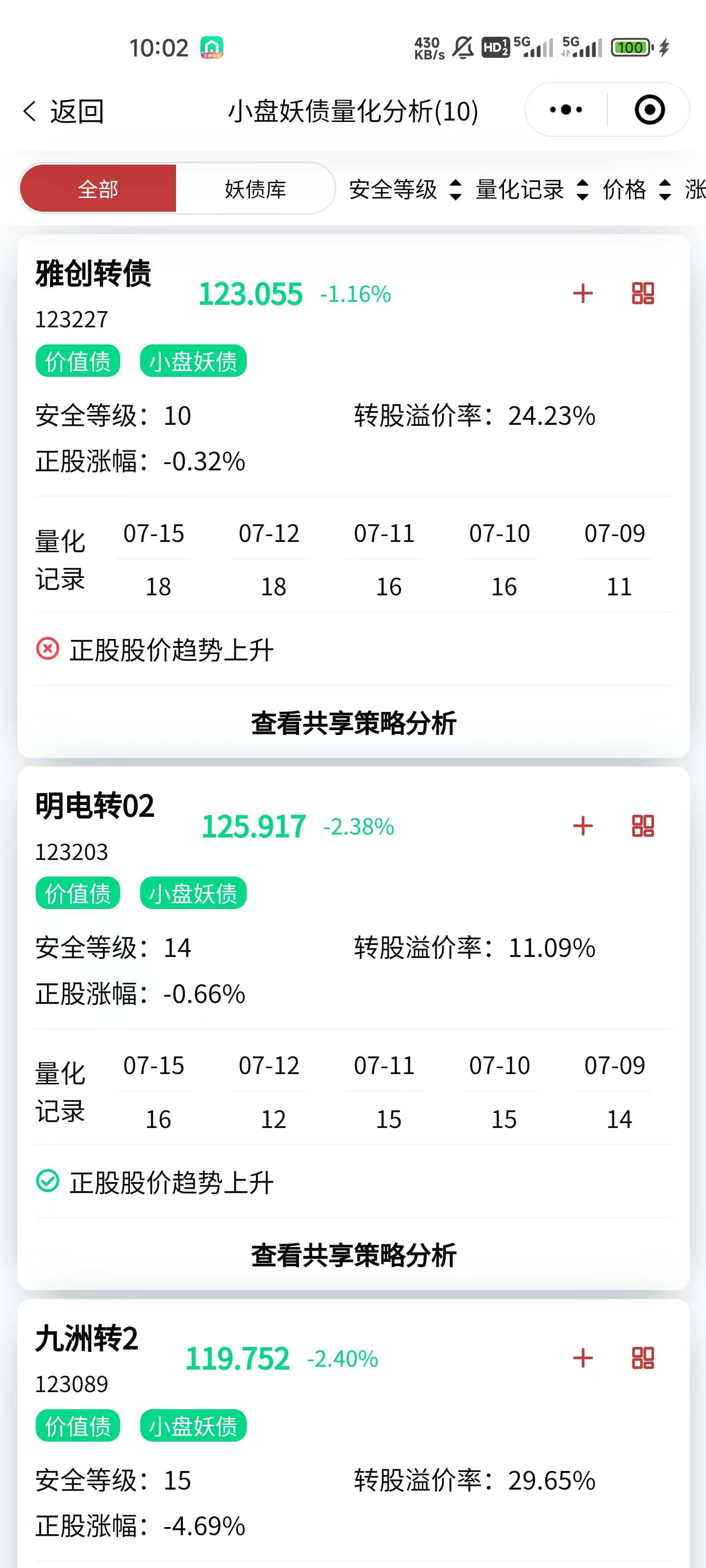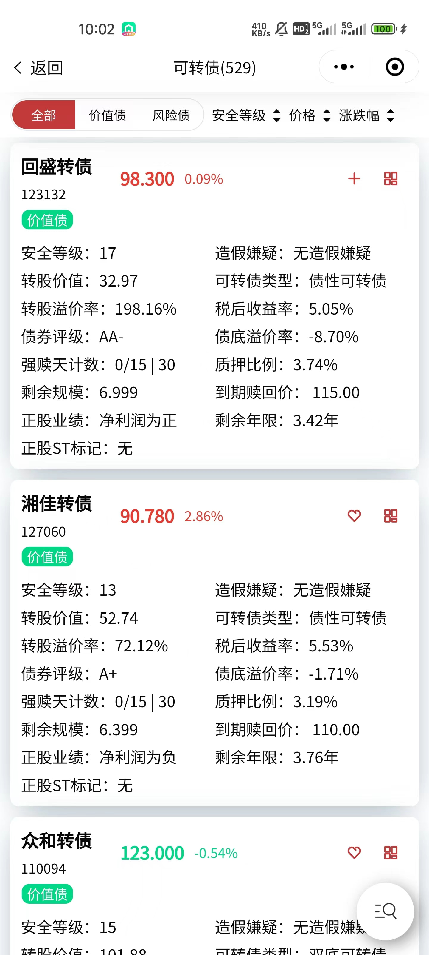 按全部、价值债、风险债类别展示可转债数据,并显示安全等级(等级越高,一般说明标的越安全)。