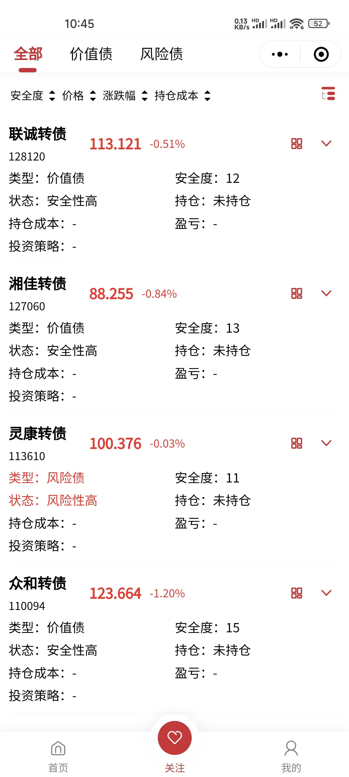 按全部、价值债、风险债类别展示用户关注的标的;实时显示盈亏及风险状况。