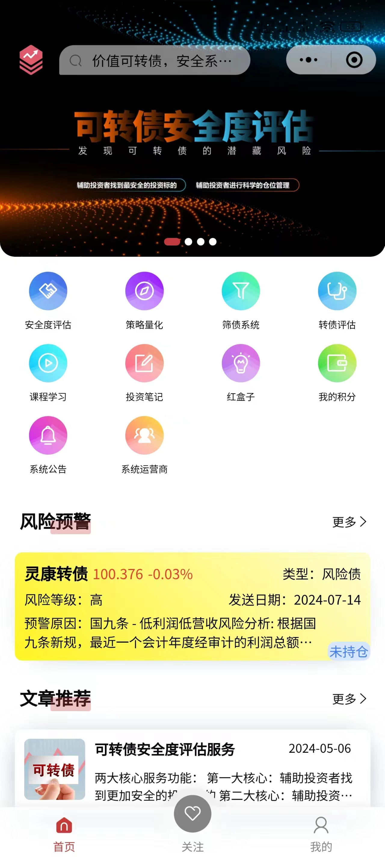 提供【安全度评估】、【小盘妖债】、【筛债系统】、【转债评估】、【课程学习】、【投资笔记】、【红盒子】、【我的积分】、【系统公告】、【系统运行商】、【风险预警】、【文章推荐】页面入口。
