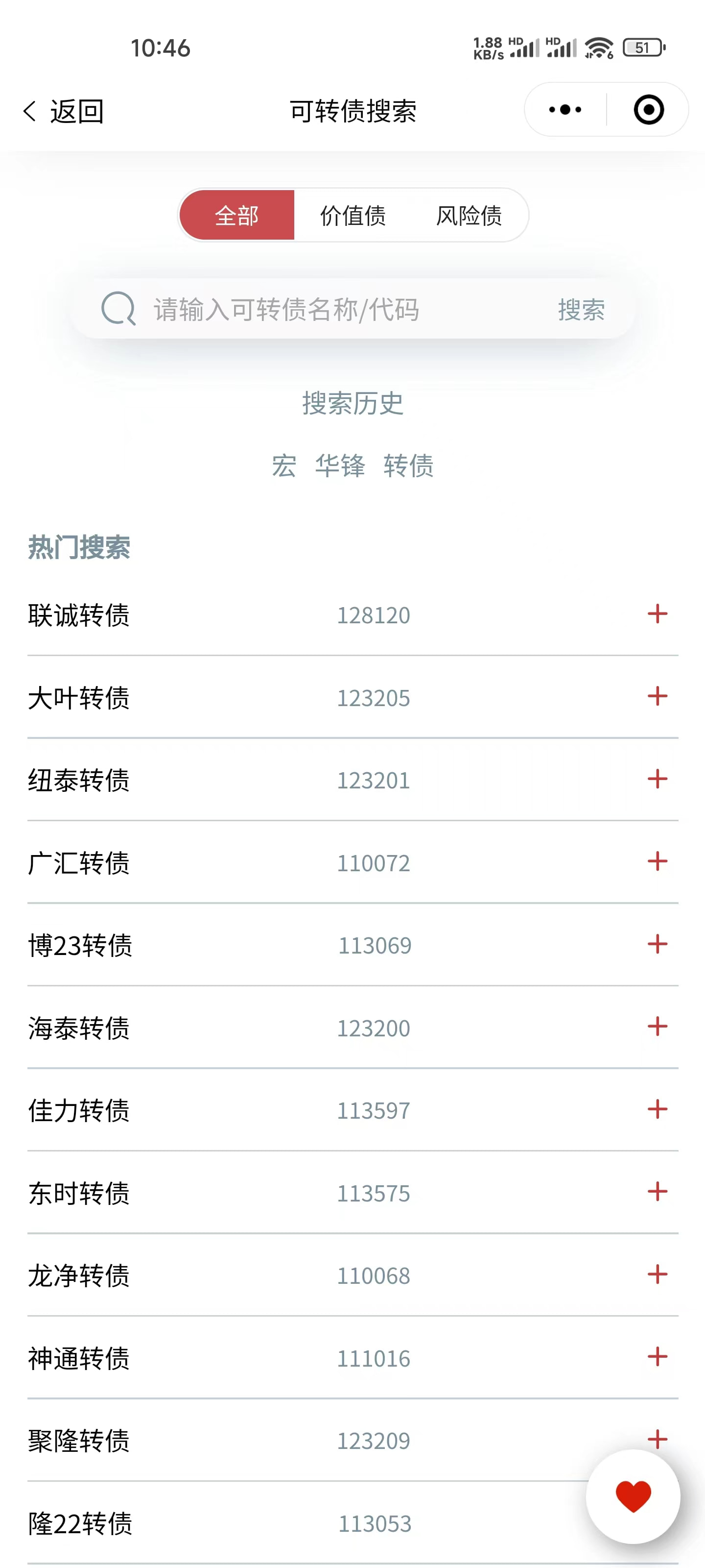 用户可以按名称、代码搜索可转债,同时按搜索量排序展示热门搜索。